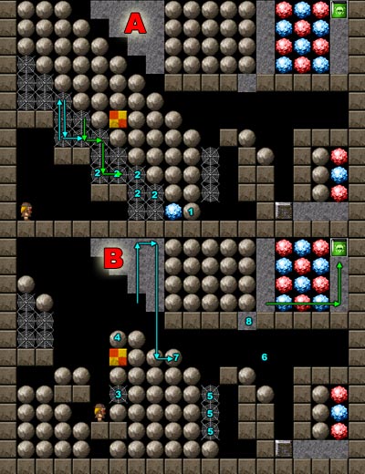 - Take gem to the right and push boulder 1 right. - Push boulder 3 steps left and dig webs marked by 2. - Now follow the blue arrows and release the boulders. You have to end up on the right side of them. - Push all incoming boulder left and after each push go back right. - When boulders stop falling follow the green arrows. - Push one left, go back, push another one left - two steps this time. Push the last one to the right. You will be in situation in the picture B. - Dig web 3 and let everything fall down. - Push 4 left. - Move joker up. - Dig webs marked by 5. - Get joker to the position 6. - Now follow the blue arrows and run quikly to the position 7. You must block the falling boulders to fall right. - Wait while things are moving. After everything stops, dig the ground 8 and go down and right. - Push all incoming boulder left. - Follow he green arrows, take just the lowest row of the gems. Then drop the acid on the gem. Take everything except of the gem under the acid. Let the acid move left of the wall. - Now move acid to the metal plate and the rest is easy. |