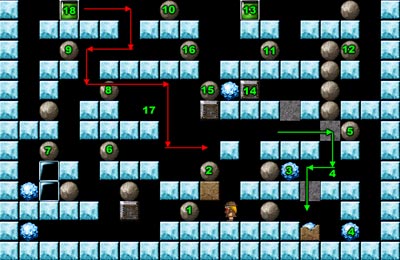 - Push the 1 left. - Push the 2 left. - Folow the green arrow, take gem 3 and 4. - Push boulder fallen to the position 4 left and follow it. Take the gem ripped out of the rock. - Push boulder on the 4 right and follow it. - Push boulder on the 4 left and go back right. Leave one boulder on the 4. - Push the 5 left. - Push the 6 and the 7 left. Break two glass bricks and take the gem. - Push the 8 right. - Push the 9 left. - Push the 10 right. - Push the 10 right. - Push the 12 left. - Move the acid 13 to the metal plate 14. Take the gem. - Push the 15 left. - Push the new boulder to the position 15 right. - Push the 16 left. - Go around and push the 16 right to the position 17. - Push the acid 18 so it follows the red arrows. Get it to the lowest metal plate and destroy it. - Take the last gem. |